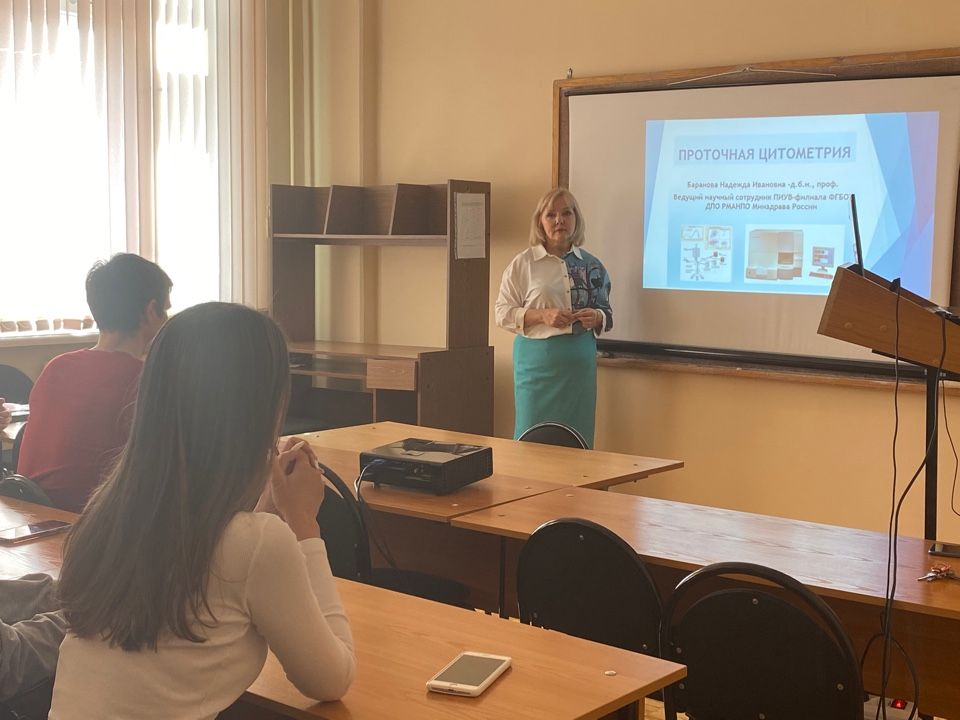 В среду, 12 апреля 2023 года, студенты направления 06.03.01 Биология в очередной раз посетили мастер-класс по клинической диагностике, проводимый на базе Пензенского института усовершенствования врачей - филиала ДПО РМАНПО Минздрава РФ в рамках Десятилетия науки и технологий. Студенты-биохимики 3 и 4 курса прослушали лекции на темы «Проточная цитофлюориметрия в иммунодиагностике» и «Иммуноферментный метод, его применение в современной лаборатории», прочитанные сотрудниками лаборатории Научно-образовательного центра ПИУВ Барановой Надеждой Ивановной (д.б.н., в.н.с.) и Ащиной Людмилой Андреевной (к.б.н., с.н.с.), после чего студенты приняли участие в экскурсии по лабораториям НОЦ, где на практике познакомились с оборудованием, которое используется для выполнения анализов методами проточной цитофлуориметрии и иммуноферментного анализа.