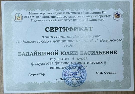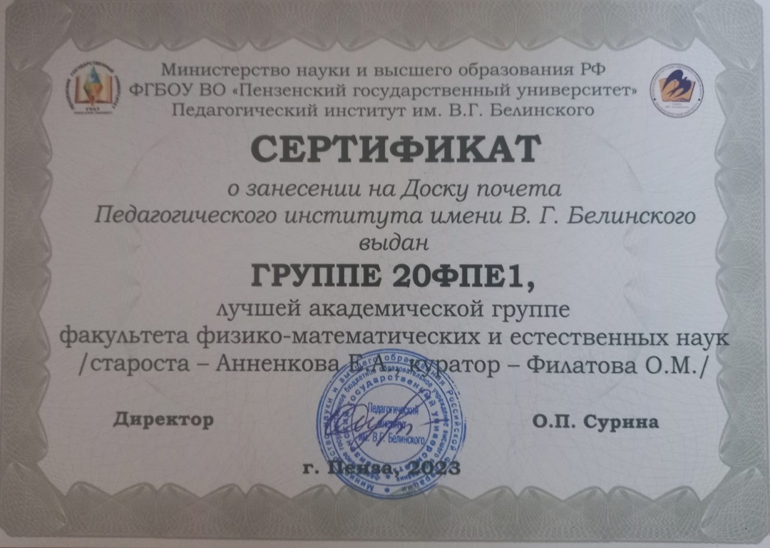 14 декабря состоялось торжественное награждение студентов и студенческих групп, отлично проявивших себя в уходящем году. Лучшей академической группой нашего факультета была признана группа 20ФПЕ (куратор – доцент кафедры ОБиБ Ольга Михайловна Филатова; староста – Екатерина Анненкова). Лучшим студентом – студентка этой же группы Юлия Бадайкина.