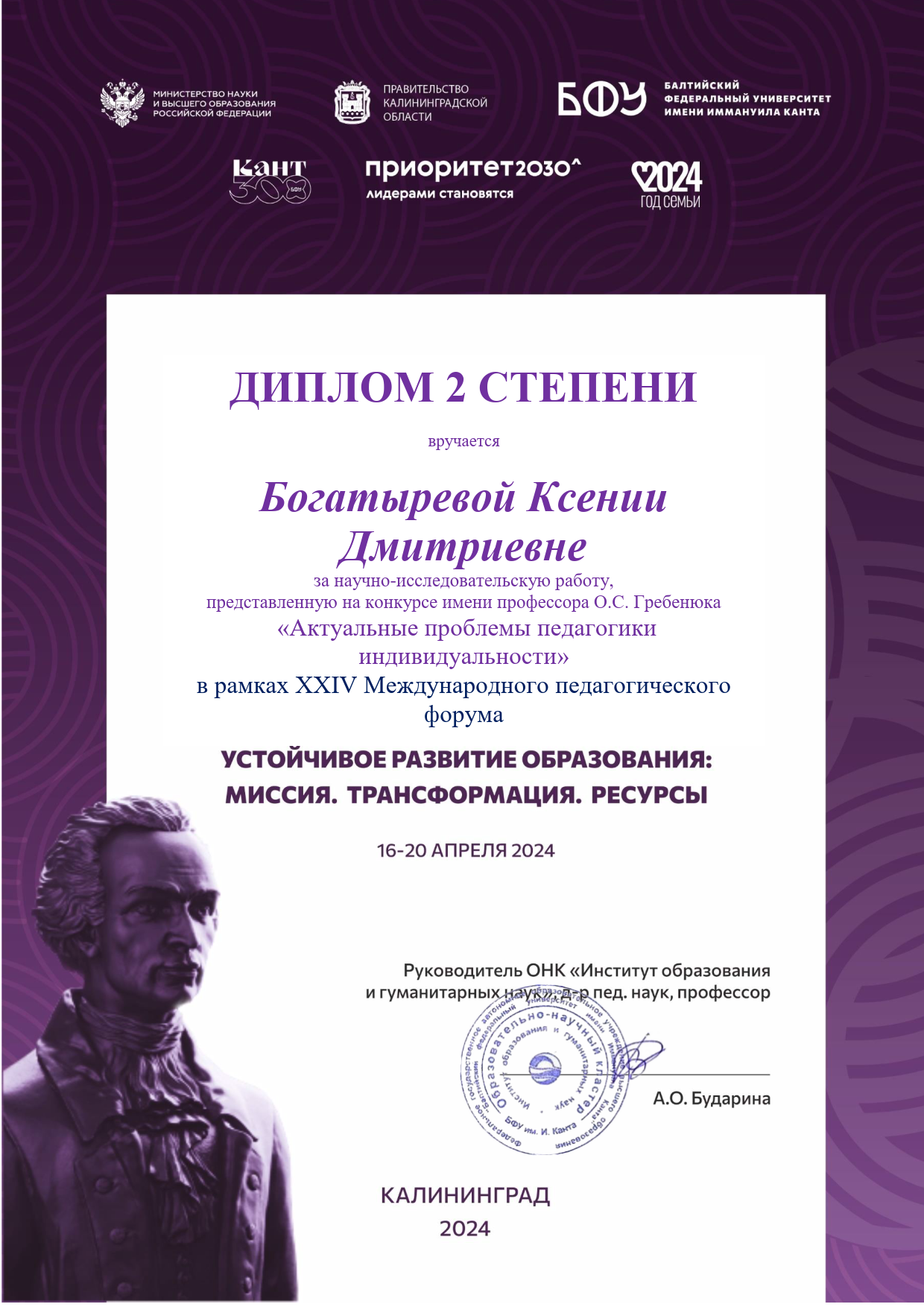 Также поздравляем научного руководителя Ксении Богатырёвой – Юлию Александровну Фатюнину, доцента кафедры ОБиБ!