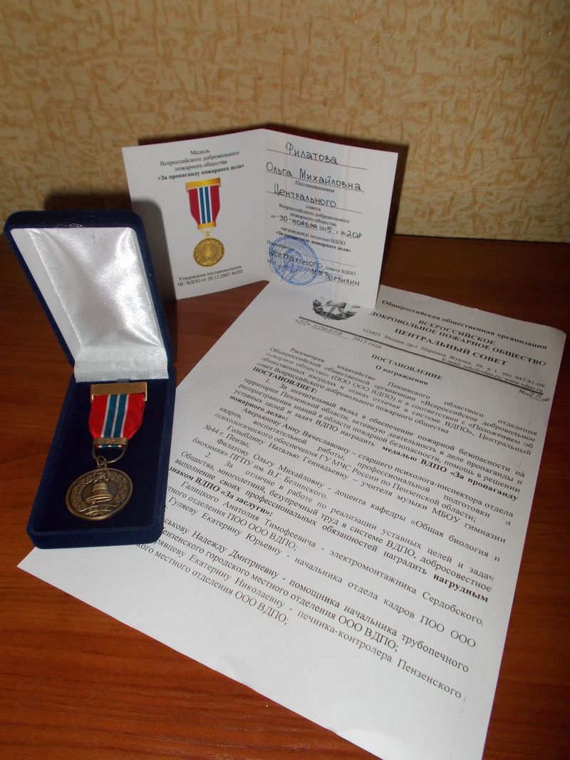 В рамках торжественного мероприятия посвященного подведению итогов Всероссийского конкурса "Человек доброй воли" в соответствии с постановлением Центрального совета Всероссийского добровольного пожарного общества за значительный вклад в обеспечение пожарной безопасности на территории Пензенской области, активную деятельность в деле пропаганды и распространения знаний в области пожарной безопасности, помощь в решении уставных целей и задач ВДПО Филатова Ольга Михайловна была награждена медалью ВДПО "За пропаганду пожарного дела"